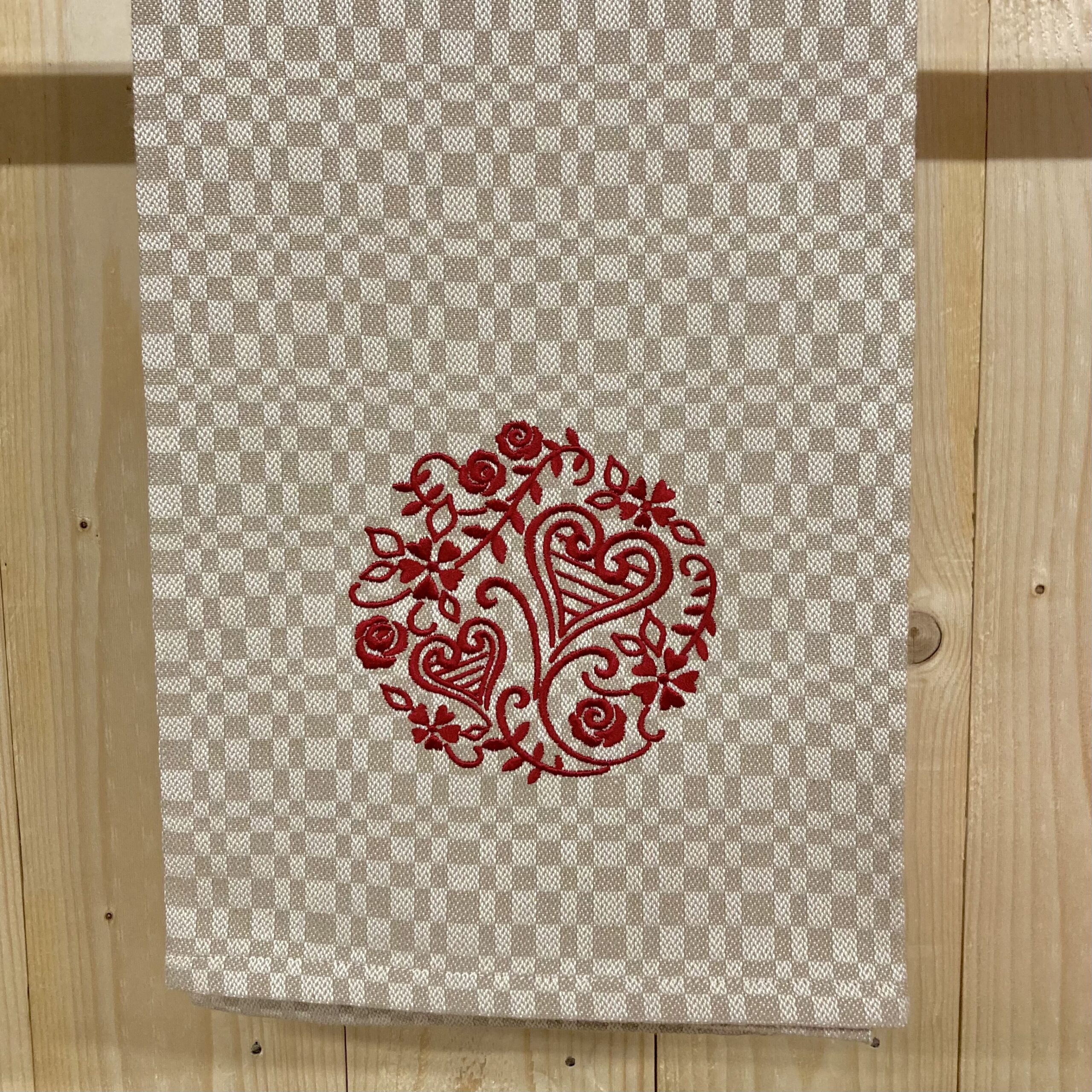 Broderad handduk, rosor och hjärtan